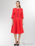 Платье с пышной юбкой в складку, приталенного силуэта, длиной чуть ниже колена. Контрастная планка, пояс и манжеты выступают акцентами модели. Прилегание обеспечивают рельефы выходящие из проймы. Потайная молния расположена по центру спинки.