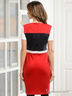 Трикотажное платье футляр, длиной чуть выше колена. Акцентом является контрастная V-образная отделка, расположенная на полочке изделия и рукава. По центру спинки расположена потайная молния.