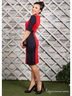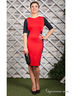 Трикотажное платье футляр на поясе, приталенного силуэта, длиной до середины колена. Платье с контрастными рельефами и рукавом реглан длиной ¾. Потайная молния расположена по центру спинки. Для комфорта движения по спинке, низ среднего шва оформлен в виде шлицы.