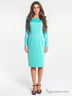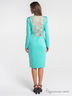 Платье футляр, плотно прилегающего силуэта, длиной выше колена. На полочке платья расположены рельефы переходящие в талиевые вытачки и заканчивающиеся по линии бедер. Спинка декорирована кружевной фигурной вставкой. По низу платья расположена шлица. В боковом шве – потайная молния.