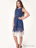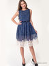 Платье, приталенного силуэта, длиной до середины колена, состоит из двух слоев ткани: верхний – шифон, декорированный кружевом, нижний – трикотаж джерси. Юбка платья на трикотажная подкладке дополнена дополнительным уровнем сборки, который придает пышность. По центру спинки расположена молния.