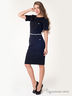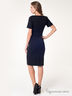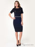 Платье футляр, приталенного силуэта, длиной до середины колена. Платье декорировано по поясу цепочкой искусственного жемчуга. На груди и по бедрам расположены карманы. По центру спинки расположена потайная молния, по низу изделия – шлица.