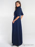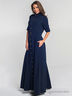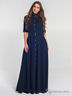 Демисезонное платье длиной в пол, из плотной ткани «Диор», приталенного силуэта. Прилегание на лифе достигается за счёт рельефов, выходящих из проймы. На модели акцентами выступают воротник-стойка, пришивные карманы на груди со встречной складкой и золотые пуговицы, расположенные по центру планки. Приятным функциональным дополнением являются потайные карманы в боковых швах.