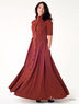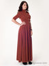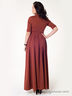 Демисезонное платье длиной в пол, из плотной ткани «Диор», приталенного силуэта. Прилегание на лифе достигается за счёт рельефов, выходящих из проймы. На модели акцентами выступают воротник-стойка, пришивные карманы на груди со встречной складкой и золотые пуговицы, расположенные по центру планки. Приятным функциональным дополнением являются потайные карманы в боковых швах.