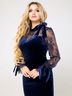 Невероятно красивое женское платье-футляр Рамона. Область декольте и рукава украшает гипюр. Манжеты рукавов на резинке, украшенные завязками. Воротник-стойка. На плече бантик из велюра, крепится к изделию булавкой. Застегивается по центру спинки на декоративные пуговки. Длина изделия: 92 см. Длина рукава: 66 см. Параметры модели на фото: 85*68*90 см.