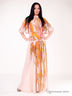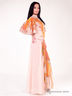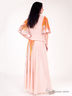 Романтическое платье длиной "в пол", отрезное по линии талии с летящим низом. Воротник - стойка. Рукав - "крылышко". Юбка расклешенная "полусолнце". Декоративная деталь - съемный бант-галстук. Платье оформлено цветной росписью по ткани. Длина юбки - 100 см.