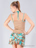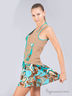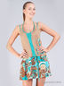 Летнее платье сарафан полуприлегающего силуэта, с заниженной линией талии. Бретели и центральная вставка полочки отделаны трикотажем. На левой полочке стилизованная вышивка-аппликация. На юбке по линии талии заложены глубокие встречные складки. Платье выполнено в бежево-бирюзовых тонах.