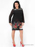 Платье, выполненное из сочетания двух тканей: лёгкого шифона и плательной ткани. Кокетка переда и спинки декорирована кружевом и стразами. Боковые швы украшены золотистыми пуговицами. Рукав втачной, длинный.