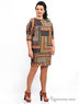 Платье свободного силуэта, украшением платья является оригинальная брошь. Вырез горловины неглубокий. По переду платья и по рукаву застрочены складочки. Рукав длиной 3/4 по низу с манжетой. По вырезу горловины, низу рукава, застёжке-молнии платье декорировано кожей.