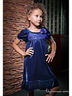 Нарядное платье прямого силуэта из бархатистой ткани. Округлый вырез горловины, короткий рукав-реглан, полочка декорирована пайетками и атласным цветком, низ изделия дополнен воланом.