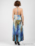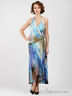Детали: вырез воротник халтер с тонкими завязками на шее, ассиметричная расклешенная юбка с запахом, изящное декоративное украшение на поясе.