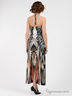 Детали: округлый вырез горловины, тонкие завязки на шее, слегка расклешенная юбка.