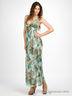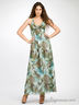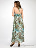 Платье шифоновое с набивным рисунком. На подкладке. Отрезной лиф на бретелях, завязывающихся на шее. Завышенная линия талии. Пояс посажен на многорядную резинку.