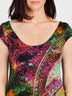 Детали: круглый вырез, короткие рукава, ассиметричный крой низа, яркий оригинальный принт