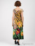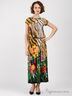 Детали: V-образный вырез горловины декорирован лентами, короткие рукава, отрезной пояс на резинке, яркий принт на подоле платья, без подкладки и застежки.