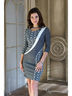 Платье из плотного трикотажа, сильно прилегающего силуэта. Декорировано изделие контрастными вставками и кантом. Втачной рукав 3/4. Длина по спинке 89-103 см. в зависимости от размера.