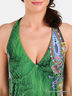 Детали: V-образный вырез горловины, отрезной лиф, лямки на шее, принты