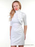 Очаровательное платье с короткими рукавами и воротником-стойкой. Модель приталенного кроя выполнена из качественного материала привлекательной расцветки. Спереди - рюши. Отличный вариант на каждый день.