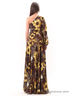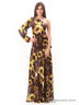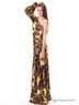 Нарядное платье длиной в пол, ассиметричное. Рукав один правый, длинный, с лифом. Низ рукава стягивается эластичной тесьмой. Линия талии занижена. Обхват талии регулируется поясом-бантом.
