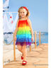 Радужный сарафанчик для девочки на переплетённых в косичку воздушных бретельках. Модель декорирована рюшами по всей длине. Прекрасный вариант для детского гардероба.
