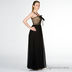 Вечернее декольтированное платье для любого торжества на тонких лямках, цвет юбки чёрный, лиф молочного цвета отделан тонким чёрным шифоном, декоративный крупный бант на груди.