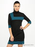 Очаровательное платье из приятного на ощупь трикотажа стильного черного цвета. Широкий воротник стойка. Короткие рукава. Застежка на незаметную молнию на спинке. Изделие декорировано оригинальными контрастными вставками. Комфортная и уютная модель прекрасно подойдет активным женщинам.