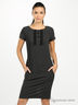 Отличное платье слегка приталенного покроя из приятной на ощупь ткани. Округлый вырез горловины. На спинке незаметная застежка на молнию. Спереди два удобных втачных кармана. Изделие декорировано пришитыми стразами на полочке и рюшами. Низ изделия с прорезью.