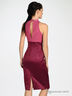 Платье необычного кроя. Верх выполнен из тонкого шифона. Низ атласный. Ворот украшен изящной лентой, завязывающейся в бант. Застегивается на пуговку и молнию.