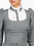 Детали: застежка на молнию на спине, длинный рукав с рюшей, ворот-стойка декорирован рюшей, низ изделия дополнен простроченными складками