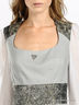 Платье светло-серое на молнии с блестящим поясом и плечами, с белыми хлопковыми рукавами.