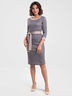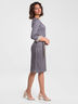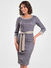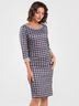 Платье приталенного силуэта выполнено из трикотажа меланж с интересным принтом "крупная гусиная лапка", с отделкой из однотонной ткани по горловине и низу рукава. Округлый вырез горловины обработан притачной обтачкой. Рукав вшивной, 3/4.