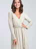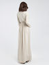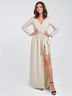 Элегантное вечернее платье макси выполнено из трикотажного полотна с люрексом. V-образный вырез горловины, переходящий в запах эффектно подчеркивает линию декольте. Лиф на подкладе. Рукава длинные, втачные.