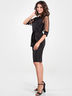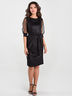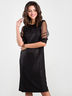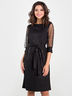 Элегантное платье прямого силуэта выполнено из эластичного трикотажного полотна в серебристую полоску. Пояс на талии подчеркнет фигуру. Короткие втачные рукава из сетки в серебристый горошек обработаны манжетами из основной ткани.