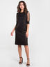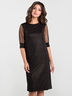 Элегантное платье прямого силуэта выполнено из эластичного трикотажного полотна в золотистую полоску. Пояс на талии подчеркнет фигуру. Короткие втачные рукава из сетки в золотистый горошек обработаны манжетами из основной ткани.