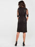 Элегантное платье прямого силуэта выполнено из эластичного трикотажного полотна в золотистую полоску. Пояс на талии подчеркнет фигуру. Короткие втачные рукава из сетки в золотистый горошек обработаны манжетами из основной ткани.