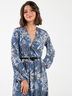 Элегантное платье выполнено из легкой плательной ткани. V-образный вырез горловины, переходящий в запах эффектно подчеркивает линию декольте. Длинные втачные рукава по низу присборены и обработаны манжетами. По линии талии платье собрано на резинку. Пояс входит в комплект.