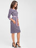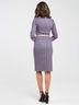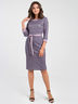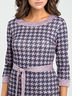 Платье приталенного силуэта выполнено из трикотажа меланж с интересным принтом "крупная гусиная лапка", с отделкой из однотонной ткани по горловине и низу рукава. Округлый вырез горловины обработан притачной обтачкой. Рукав вшивной, 3/4.