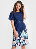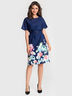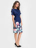 Платье полуприлегающего кроя выполнено из костюмной ткани с ярким цветочным бордюром. Вырез горловины "лодочка" обработан внутренней обтачкой. Рукав цельнокроеный со спущенной проймой. Пояс входит в комплект.