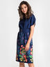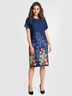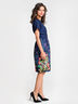 Платье полуприлегающего кроя выполнено из костюмной ткани с ярким цветочным бордюром. Вырез горловины "лодочка" обработан внутренней обтачкой. Рукав цельнокроеный со спущенной проймой. Пояс входит в комплект.