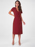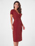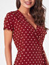 Платье приталенного силуэта выполнено из плательной ткани с модным принтом в горошек. Рукав вшивной, короткий. V-вырез горловины, переходящий в запах, обработан кантом.