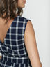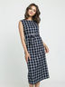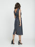 Платье "миди" прямого кроя выполнено из костюмной ткани с модным принтом в клетку. Округлый вырез горловины на спинке переходит в угловой. Вырез горловины и проймы обработаны цельнокроеной внутренней обтачкой. Пояс с пряжкой входит в комплект. Сзади по низу платья разрез.