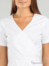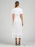 Длинное платье с запахом. V-образный вырез. Короткие рукава. Низ изделия украшен ажурными оборками.