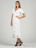 Длинное платье с запахом. V-образный вырез. Короткие рукава. Низ изделия украшен ажурными оборками.