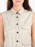 Детали: отложной воротник-стойка, без рукавов, застегивается на пуговицы, талия на втачном поясе-резинке и кулиске, спереди 2 втачных кармана и 2 прорезных кармана на клапане и пуговице, сзади шлица