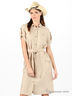 Детали: втачной отложной ворот с острыми углами на небольшой стойке с застежкой на пуговице, короткий рукав-сафари, четыре накладных кармана на пуговицах, застежка на пуговицах, шлевки под ремень, ремень из основного материала в комплекте позволяет придать приталенный силуэт.