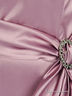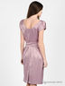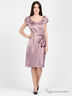 Стильное платье из плотной атласной ткани. V-образный вырез горловины. Застежка на спинке на молнию. Короткие рукава-фонарики. На полочке заложены две встречные складки. На спинке расположена шлица. Талия подчеркивается с помощью оригинального пояса с застежкой на крючок. Прекрасный вариант для создания праздничного образа!
