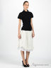 Элегантное платье приталенного кроя. Верх выполнен из плотно, них из струящейся ткани. Присборенная юбка неравномерной длины придает платью пикантности. Застегивается на молнию.