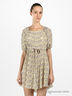 Нежное платье приталенного кроя из приятной к телу ткани. Овальная горловина и свободные рукава посажены на резинку. Платье выполнено из плиссированной ткани. По линии талии идет лента в цвет платья.