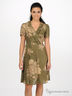 Платье приталенного кроя из приятной к телу ткани. Вырез с запахом, декорирован плиссированной тканью. Короткие рукава. Присборенная юбка-клеш.