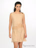 Платье прямого кроя из струящейся ткани. Присборено на линии талии. На прече декоративный элемент.